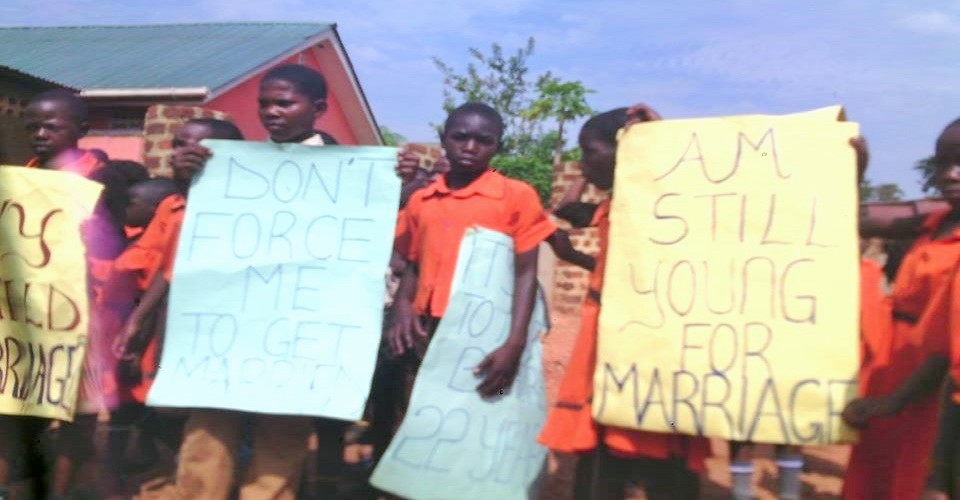 Young boys and girls displayed placards displaying information about: “NO TO CHILD MARRIAGES, DON’T FORCE ME TO GET MARRIED …” and the match past took stage in the small town of Muwanga. This was crowned by a sensitization drive to parents to refrain from selling off children like goats; and children to realize the importance of being retained in school given that the government has provided for free education in both primary and secondary levels.
